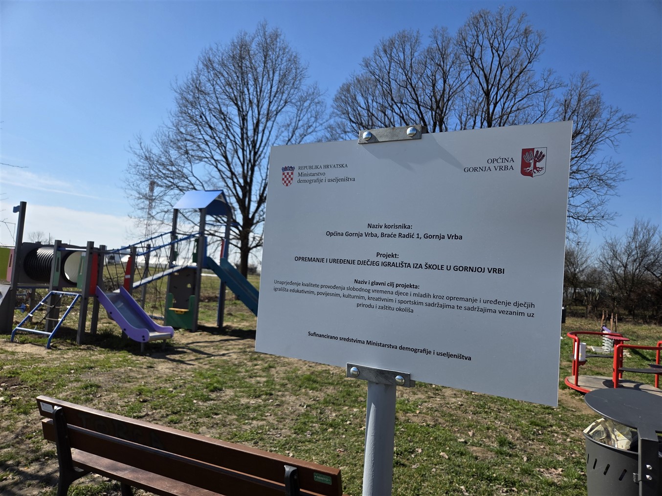 Kroz projekt su na već postojećem igralištu iza škole u Gornjoj Vrbi postavljena nova igrala i urbana oprema (kombinirano igralo, njihaljka te dvije klupe i koševi)